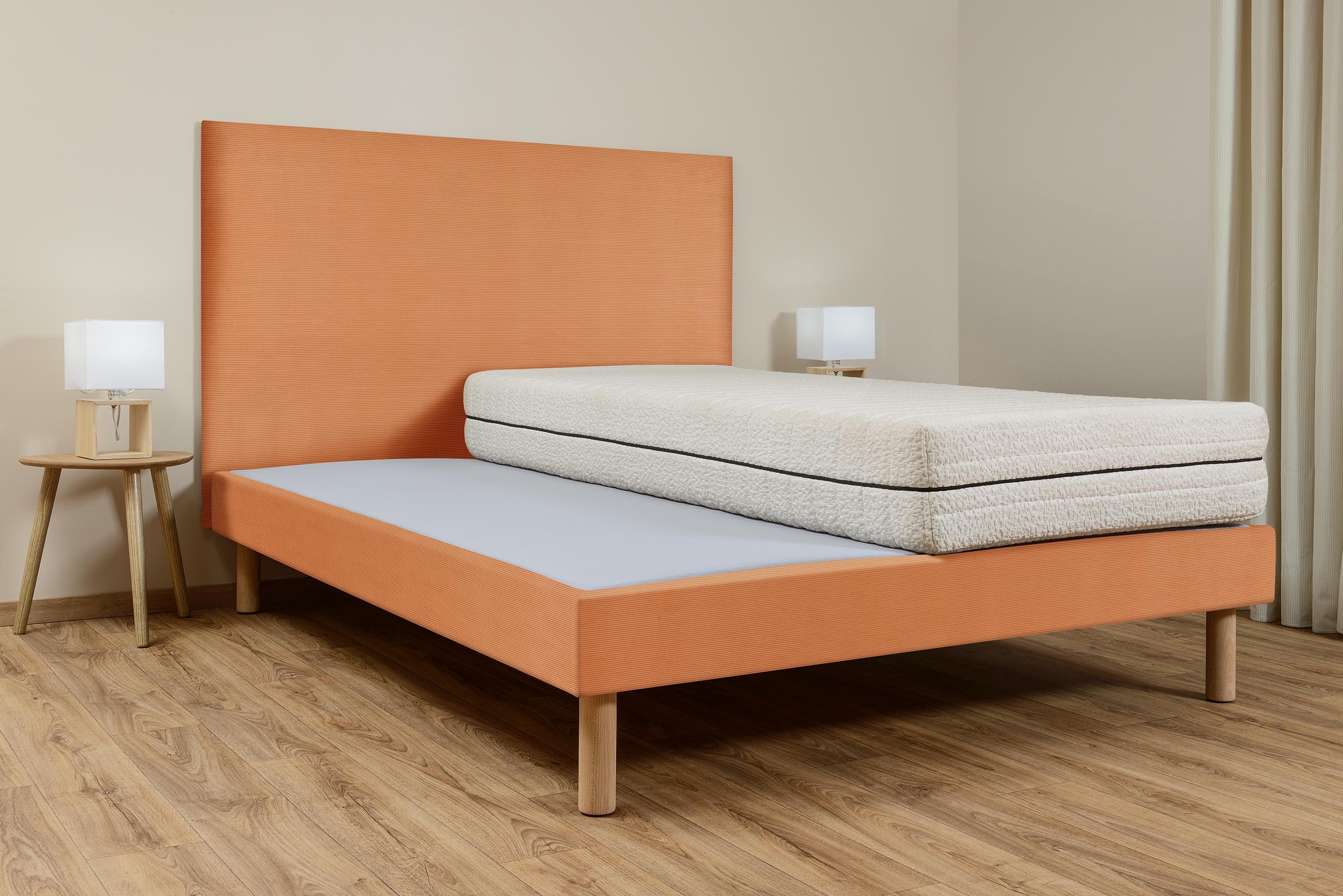 Vous pouvez coordonner ce sommier Velours Côtelé Carotte avec notre Tête de lit du même coloris.